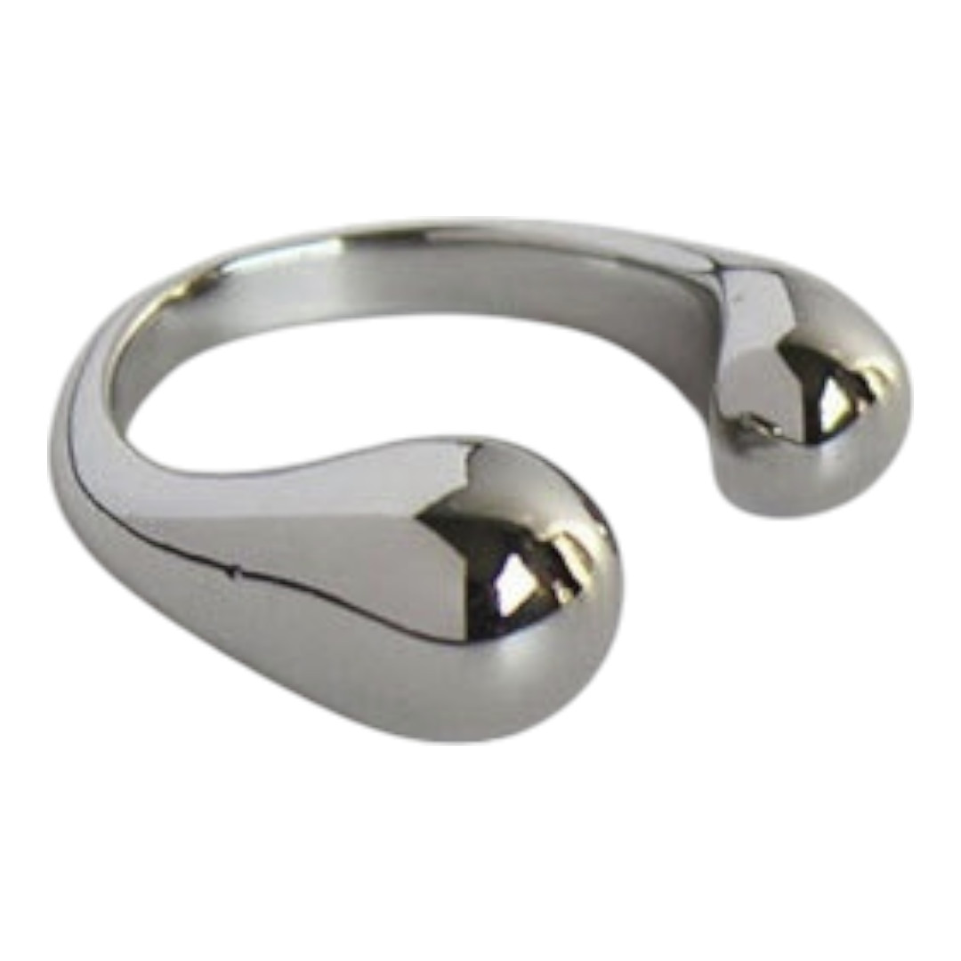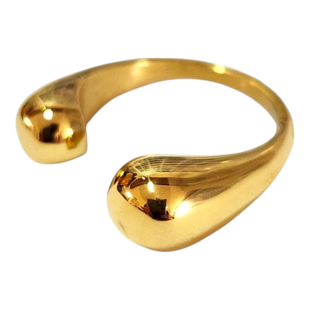 Este anillo abierto presenta un diseño elegante con terminaciones en forma de gota, donde un extremo es más delgado y el otro ligeramente más grueso, generando un contraste visual armonioso. Su estructura abierta permite un ajuste cómodo, mientras que la asimetrÃa le aporta un aire contemporáneo y refinado. Es una pieza ideal para quienes buscan un accesorio sutil, moderno y con detalles que marcan la diferencia.