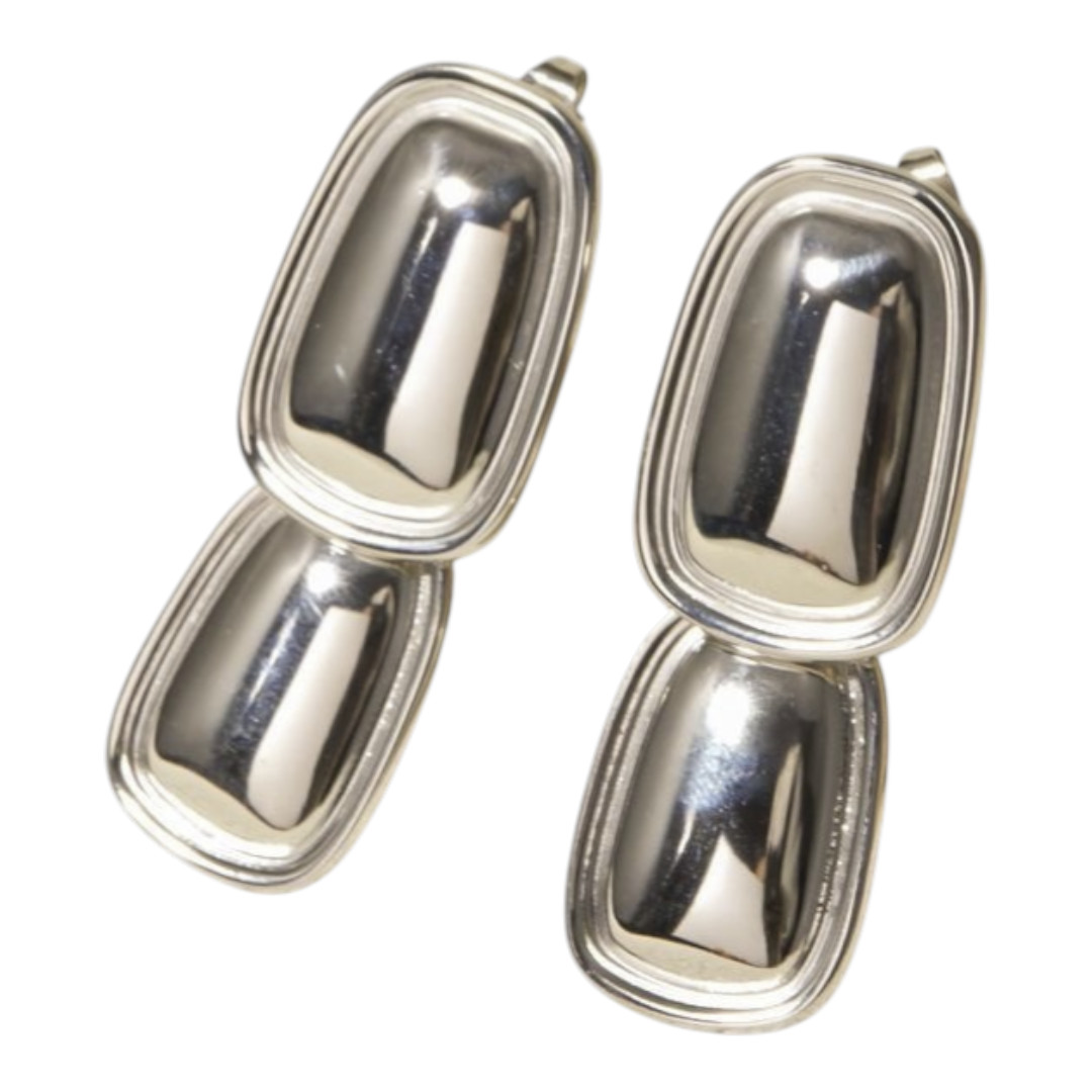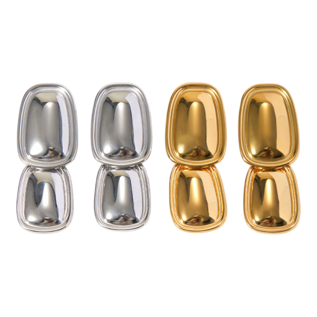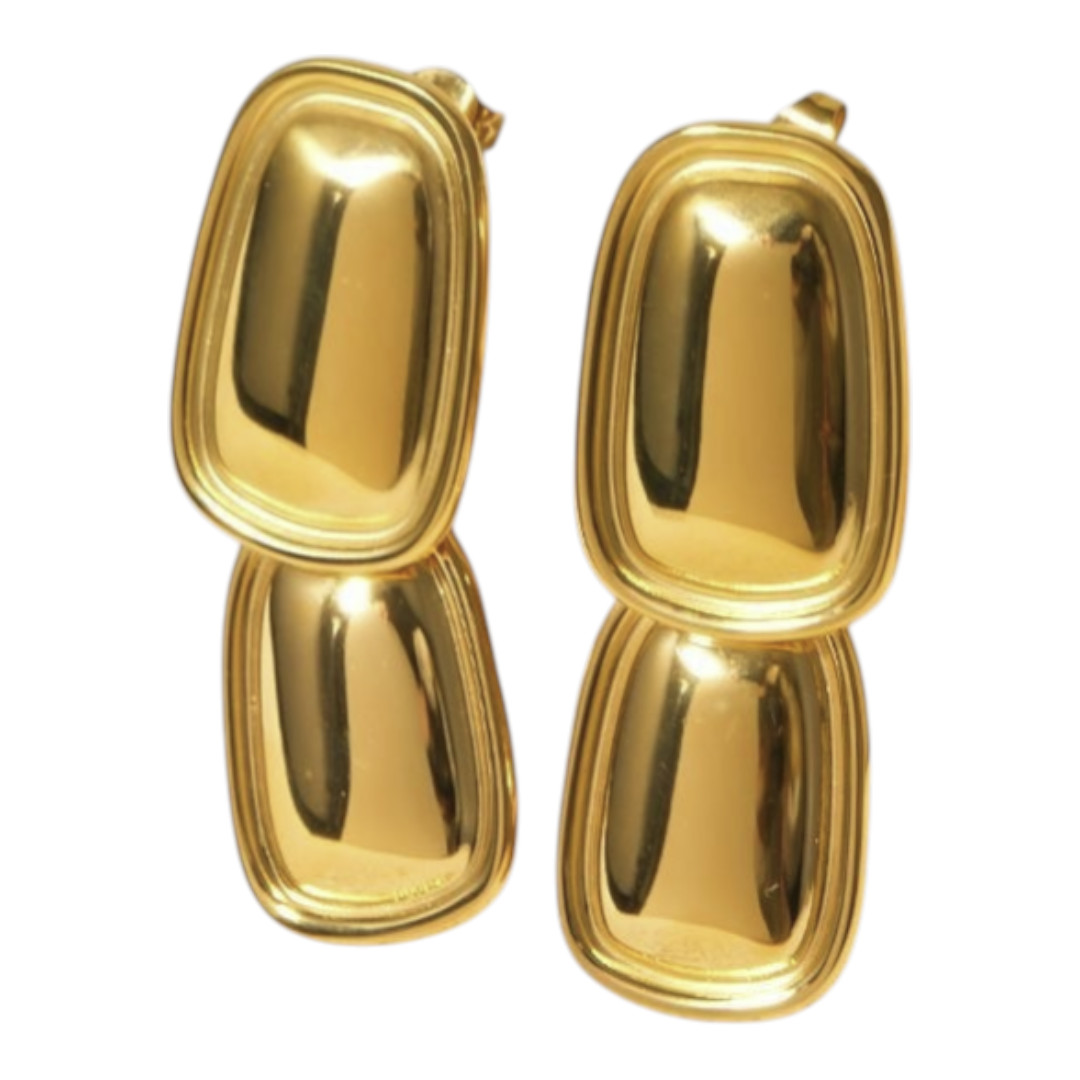 Estos magnÃficos aretes colgantes vintage combinan la elegancia clásica con un toque contemporáneo. Presentan un diseño geométrico de formas ovaladas superpuestas, disponibles en dos exquisitos acabados: dorado brillante y plateado espejo que capturan y reflejan la luz de manera espectacular.