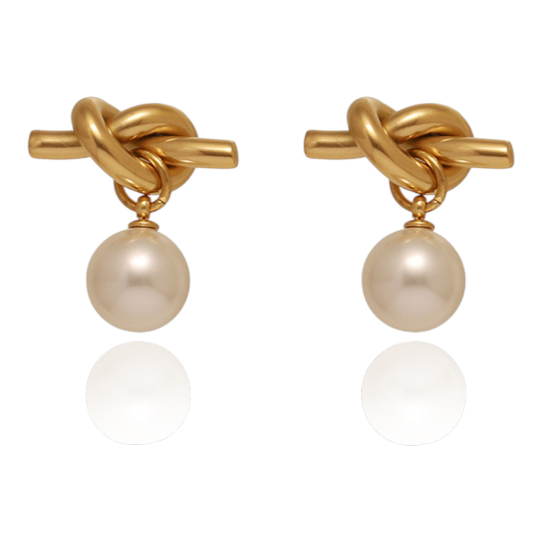 Este hermoso arete presenta un diseño refinado que combina la elegancia del oro con la pureza de las perlas. El elemento principal es un nudo dorado pulido que actúa como base, del cual cuelga delicadamente una perla blanca perfectamente redonda que añade un toque de luminosidad natural.