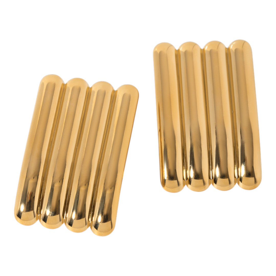 Con un diseño estructurado y un acabado tipo espejo, estos aretes rectangulares destacan por sus líneas en relieve que aportan volumen, movimiento y modernidad. Su forma alargada y simétrica genera una presencia audaz, mientras que su textura curva suaviza el look, logrando una pieza equilibrada y sofisticada. Disponibles en tono dorado y plateado, son ideales para quienes buscan una joya llamativa sin perder elegancia. Perfectos para elevar tanto atuendos minimalistas como propuestas más atrevidas.