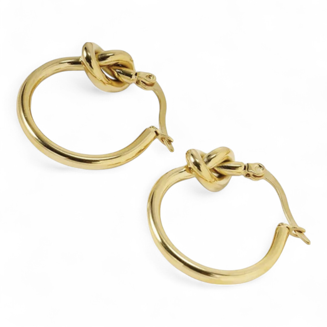 Elegantes arracadas doradas con detalle de nudo decorativo, un diseño minimalista que combina simplicidad con sofisticación contemporánea.