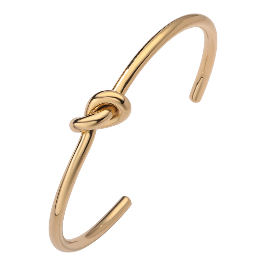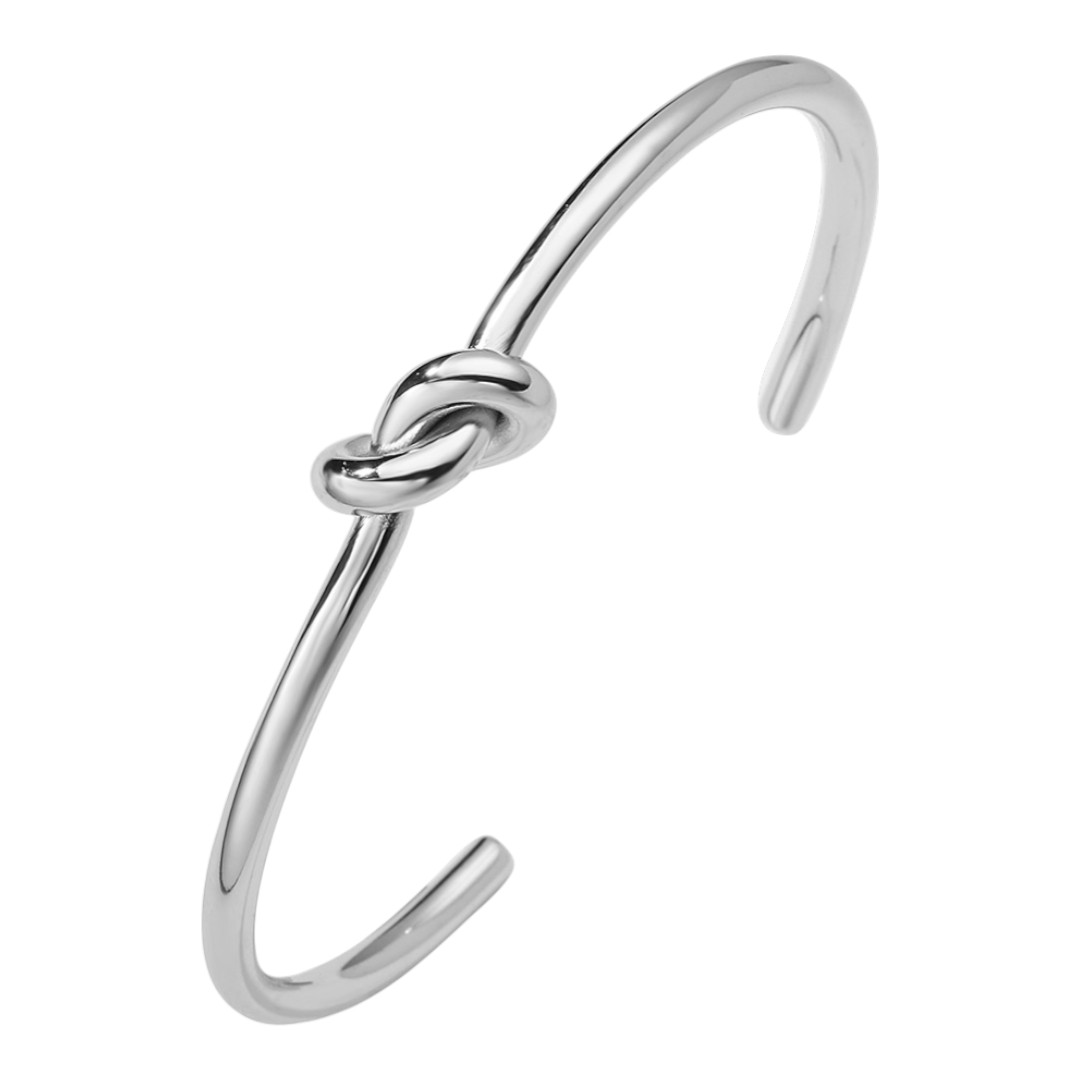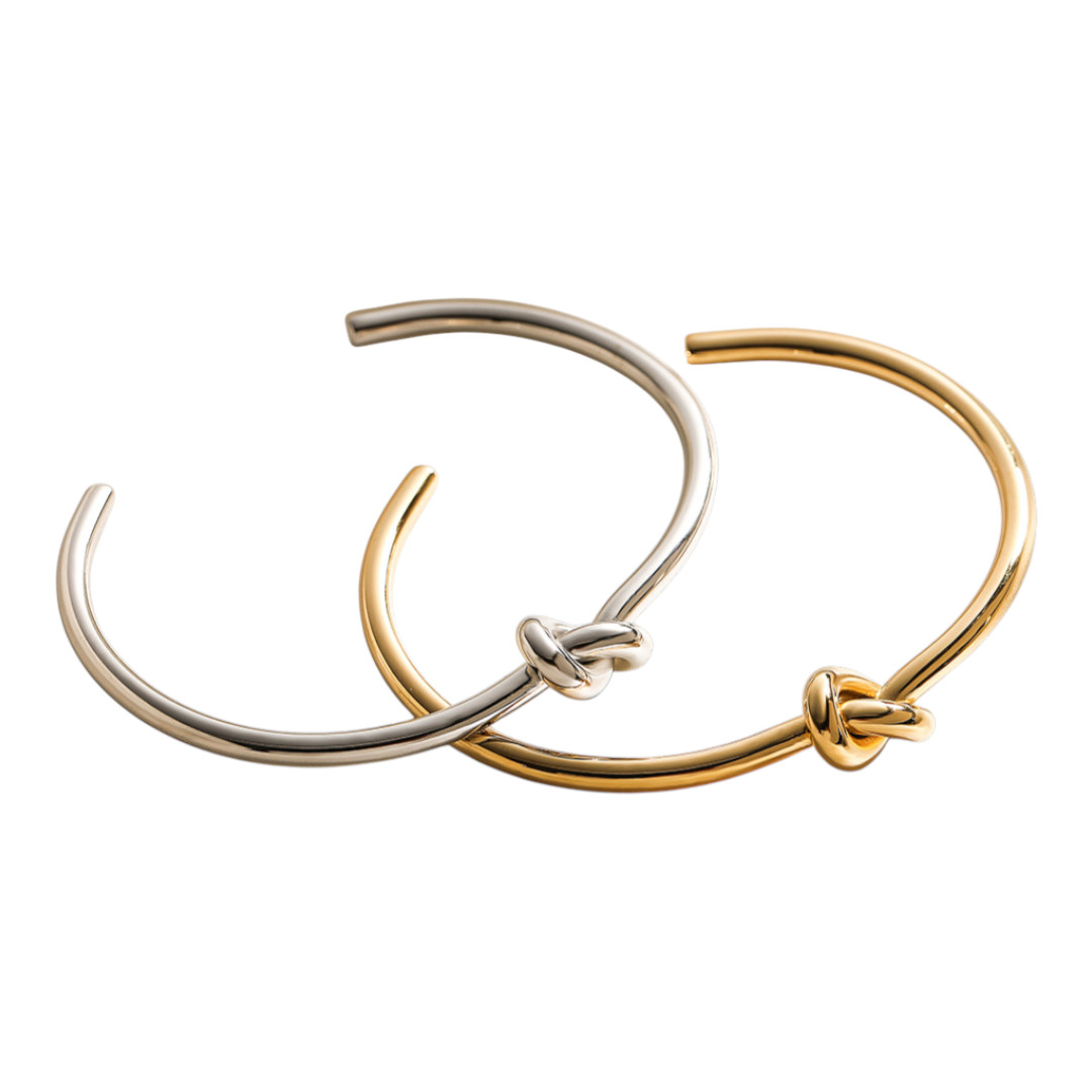 Este brazalete de estructura rÃgida se distingue por un delicado nudo al centro, que aporta un detalle visual sin romper la fluidez del diseño. Disponible en acabados dorado y plateado, su forma abierta permite un ajuste cómodo y versátil. Es una pieza que combina simplicidad y personalidad, perfecta para llevar sola o en conjunto con otros accesorios.