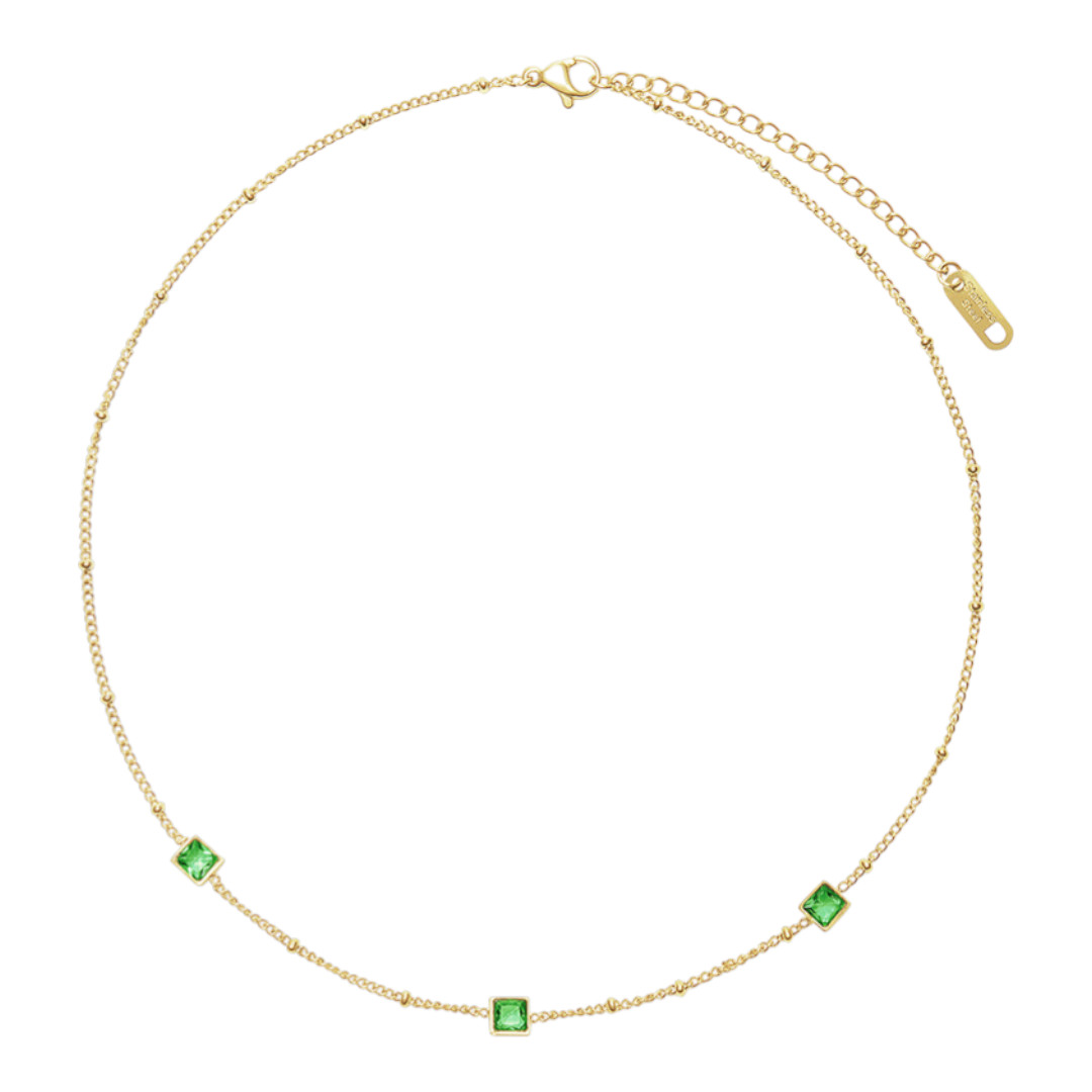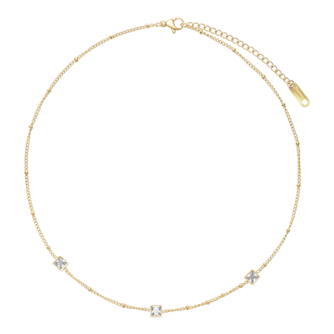 El Collar con Circonias Cuadradas es una pieza de joyerÃa contemporánea que destaca por su sofisticado diseño geométrico y su versatilidad cromática. Esta elegante pieza presenta una delicada cadena de oro de eslabones finos que sostiene tres circonias cuadradas de corte preciso, cada una enmarcada en un engaste bisel dorado que realza su forma angular y maximiza su brillo.