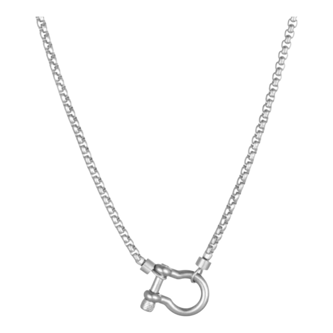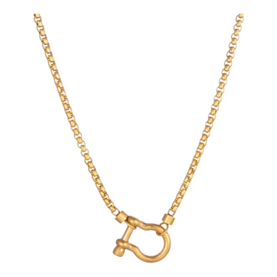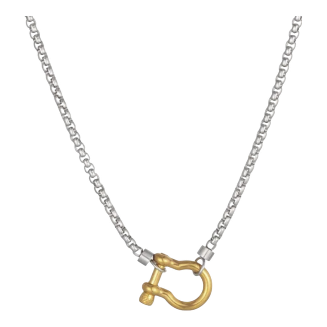 Este collar presenta una cadena de eslabones gruesos y un cierre frontal en forma de herradura que se convierte en el elemento protagonista del diseño. Disponible en tres variantes, todo dorado, todo plateado o combinado con cadena plateada y broche dorado, ofrece opciones para distintos gustos y ocasiones. Su estructura firme y estética moderna lo convierten en una pieza versátil que añade fuerza visual y elegancia a cualquier atuendo.