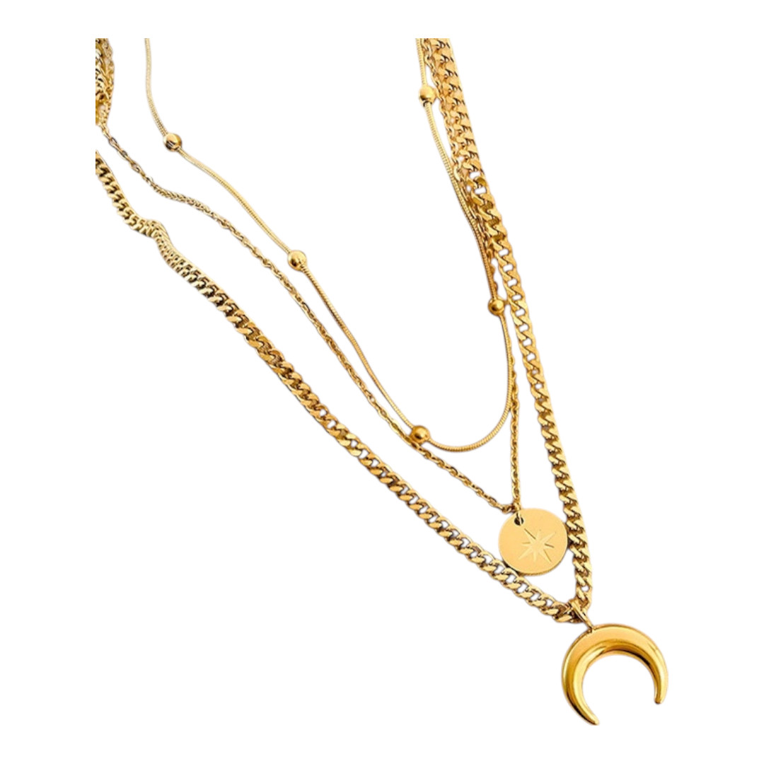 Collar triple dorado con cadenas superpuestas de diferentes texturas, destacando colgantes de medallón circular y luna creciente para un look bohemio chic.