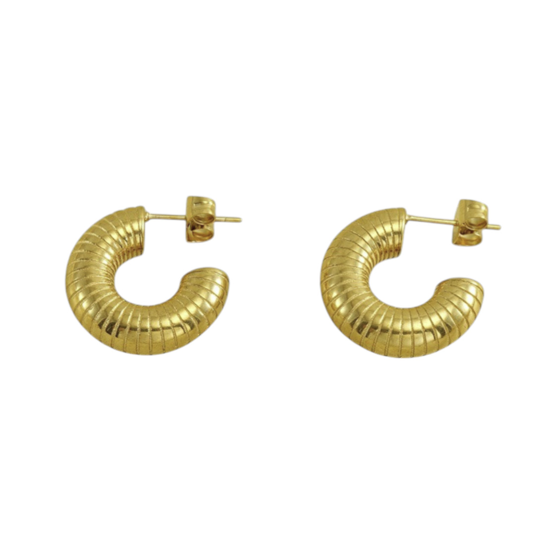 Estos elegantes mini chunky hoops combinan estilo contemporáneo con durabilidad excepcional. Fabricados en acero inoxidable de alta calidad y recubiertos con chapa de oro 18K, ofrecen el lujo del oro con una resistencia superior. Su diseño texturizado con acabado acanalado les otorga una personalidad única que captura y refleja la luz de manera hermosa.
